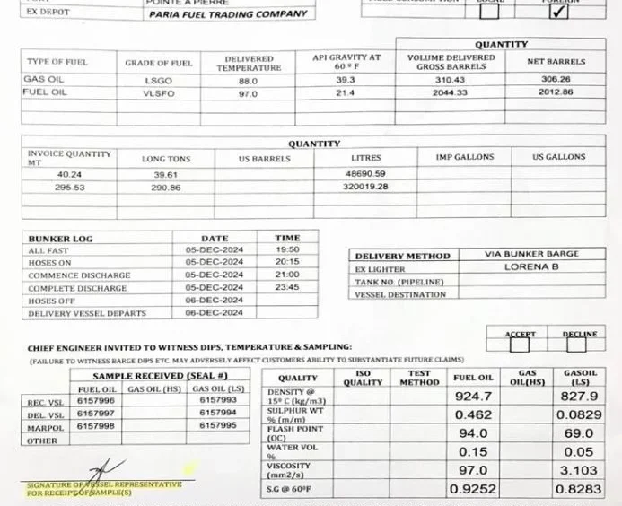 If you’re in the bridge team, note the time of bunker start and stop, barge name, and total quantity in the deck logbook. Everything must match what’s written on the