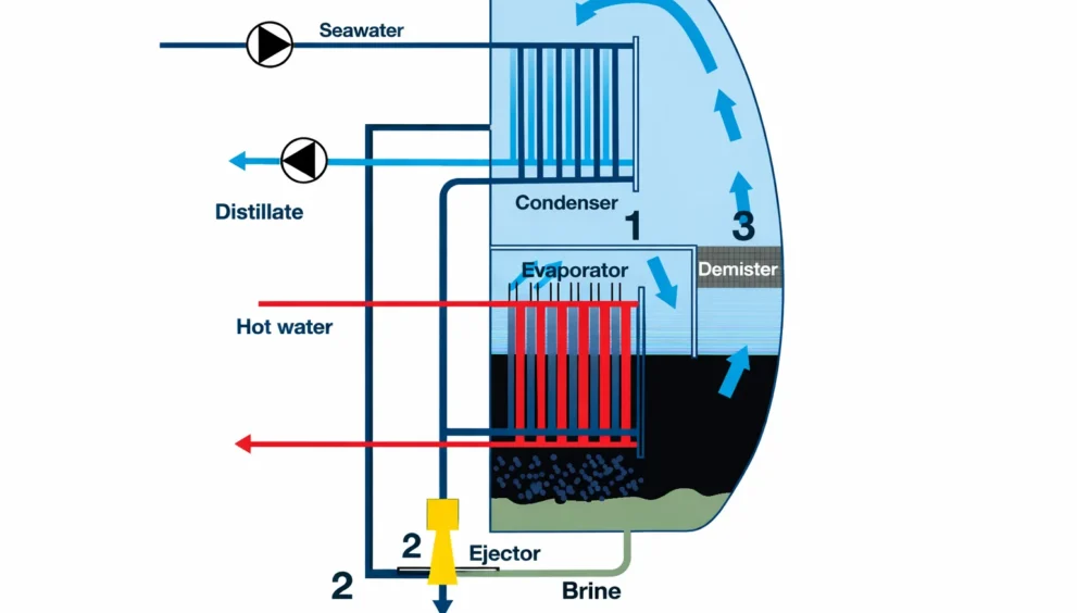 - Air/Brine Ejector: Creates vacuum and removes brine (concentrated saltwater) with air, maintaining optimal chamber conditions.