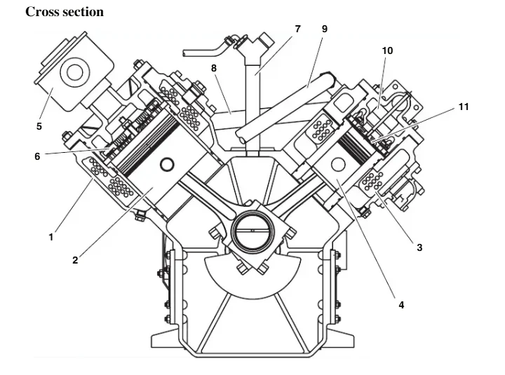 - Discharge stroke: When pressure reaches the desired level, the discharge valve opens, and compressed air is delivered to the air bottle.