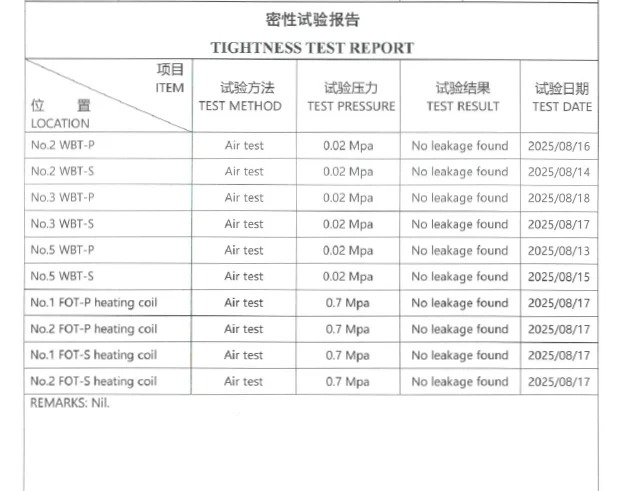Test Pressure: 0.02 MPa for tanks, 0.7 MPa for fuel oil tank heating coils