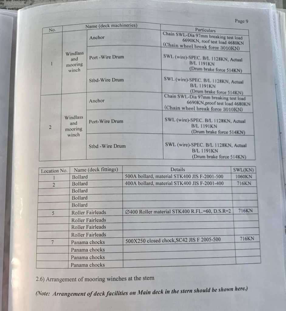 Diagrams/plans indicating the location of towing leads, strong points, bollards, fairleads and chocks.